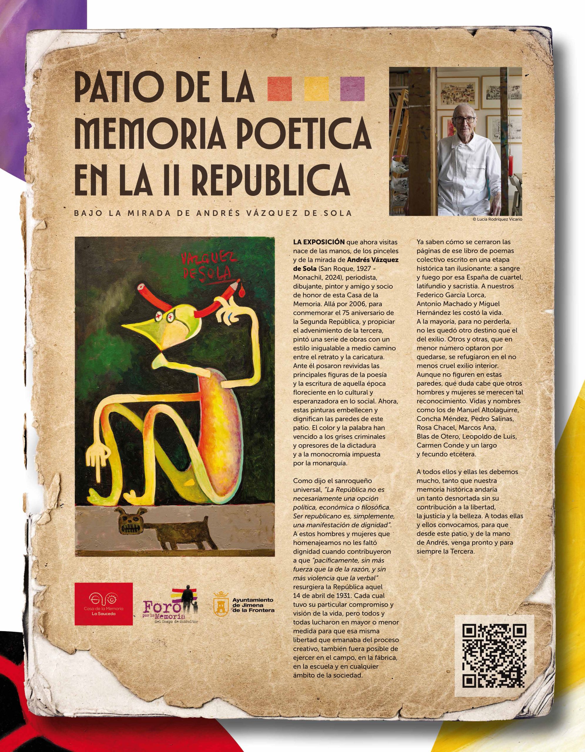 La exposición Patio de la memoria Poética en la II República está inspirada en la obra pictórica de Andrés Vázquez de Sola, periodista, dibujante, pintor, amigo y socio de honor de esta Casa de la Memoria; que, en 2006, para conmemorar el 75 aniversario de la Segunda República, pintó una serie de obras para reivindicar y homenajear a las principales figuras de la poesía y la literatura de dicho periodo histórico.
